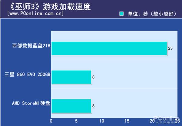 我们也可以在上面的测试中看到AMD StoreMI硬盘的读取速度十分爆表,猜测是使用内存为新硬盘加速的结果,但这在实际应用测试中没有十分明显的体现出来,游戏加载速度都与纯SSD一致。