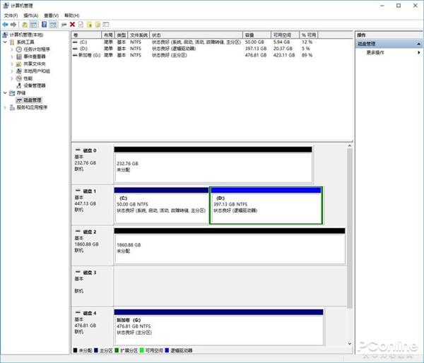 此时我们打开我的电脑管理中的磁盘管理,可以看到磁盘0和磁盘2已经没有容量了,它们融合为一个新的磁盘4我们先简单将其称为AMD StoreMI硬盘。那么我们下面就来看看这个新的磁盘性能怎么样。