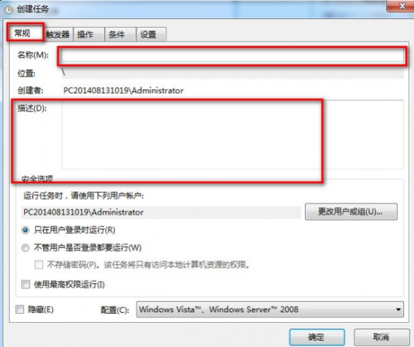 在创建任务窗口,点击“常规”选项卡,输入计划任务的信息