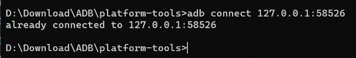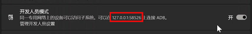 接着输入这条命令“adb connect 127.0.0.1:58526”按回车。后面的地址,就是刚刚在安卓子系统设置界面显示的那个地址。