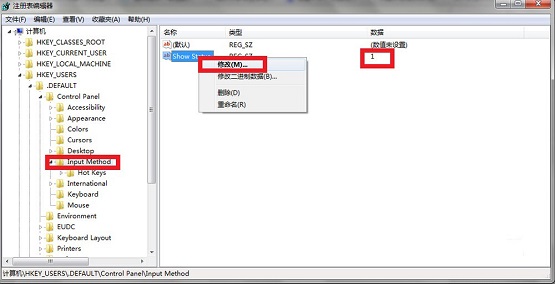然后依次选择“HKEY_USERS.DEFAULTControl PanelInput Method”右边窗口中的 “Show Status”点击右键然后点“修改”,将数据数值栏修改为“1”然后重启电脑就可以了