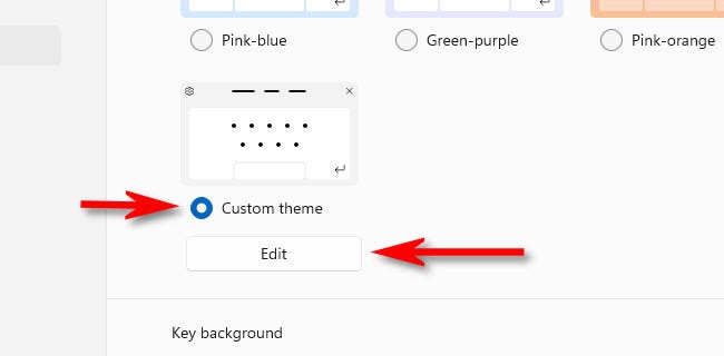 您还可以在触摸键盘上设置自定义颜色。为此,请从主题列表中选择“自定义”,然后单击“编辑”。