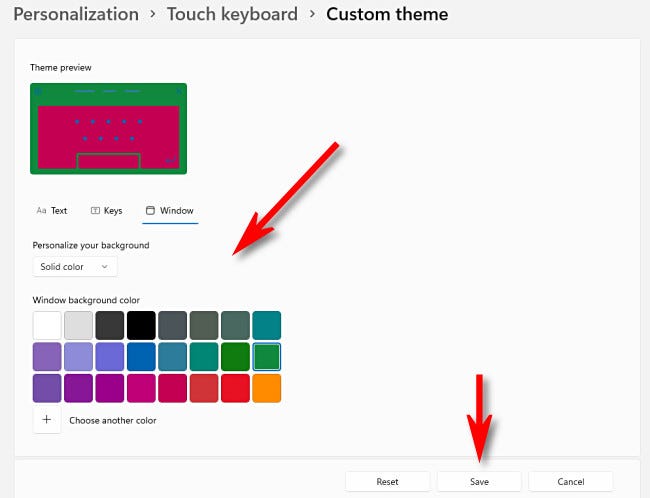 在自定义主题编辑屏幕上,您可以为键盘上的文本、按键本身和触摸键盘窗口边框选择自定义颜色。您甚至可以使用自定义图像文件作为窗口背景。在编辑时使用“主题预览”正下方的选项卡在这些项目之间切换,然后选择下面的颜色。完成后,单击“保存”。