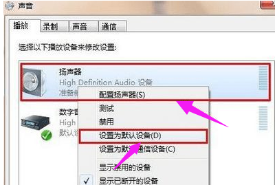 在声音的窗口里面选择扬声器,并右键菜单中选择“设置为默认设备”,最后按“确定”按钮即可。