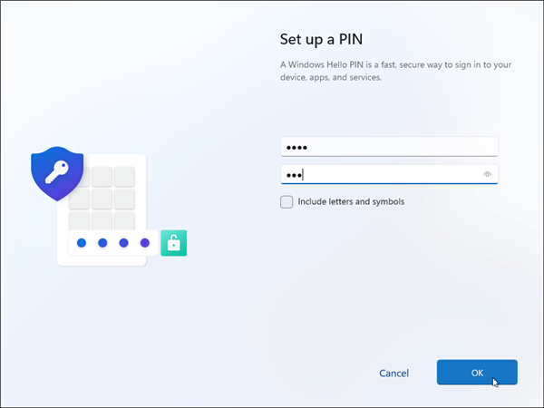然后设置向导会要求您输入用于登录的PIN码。如果您想使其成为更强大、更复杂的PIN码,请单击“包括字母和符号”框。这允许您使用字母、符号、数字和特殊字符创建PIN。