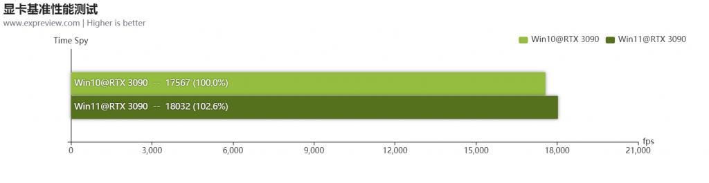 首先我们使用 3DMark 做一个简单的显卡基准性能测试,可以看到 Time Spy 里,Windows 11 三次成绩分别是 18246、18052 和 17798(三次平均为 18032),而 Windows 10 里三次成绩分别是 17618、17582 和 17500(三次平均为 17567),Windows 11 略微高出,但差距并不大。3DMark 有多个测试项目,Time Spy 是显卡在 DirectX 12 游戏中,2K 分辨率的性能指数。显卡基准性能测试并不是这次测试的重点,只是作为一个参考。