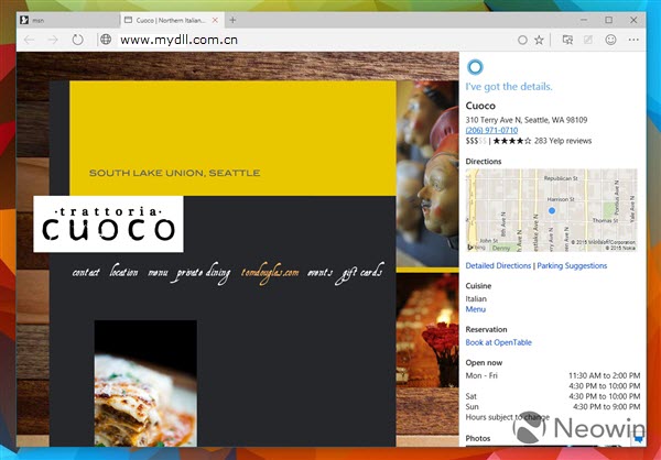 如果你正在浏览参观或者零售店的网站,小娜会自动出现在地址栏,告诉你她知道很多,点一下就会出现这家店的开业时间、菜单、评价、地图、照片等等。实时查询有用信息更是小菜一碟,比如输入个天气、航班什么的。如果浏览器崩溃了,小娜也会在重新打开后立刻恢复此前的样子。