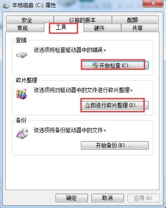 4、打开磁盘属性,点击“工具-开始检查”检查磁盘中的错误,在点击“立即进行碎片整理”,进行修复错误,如图所示: