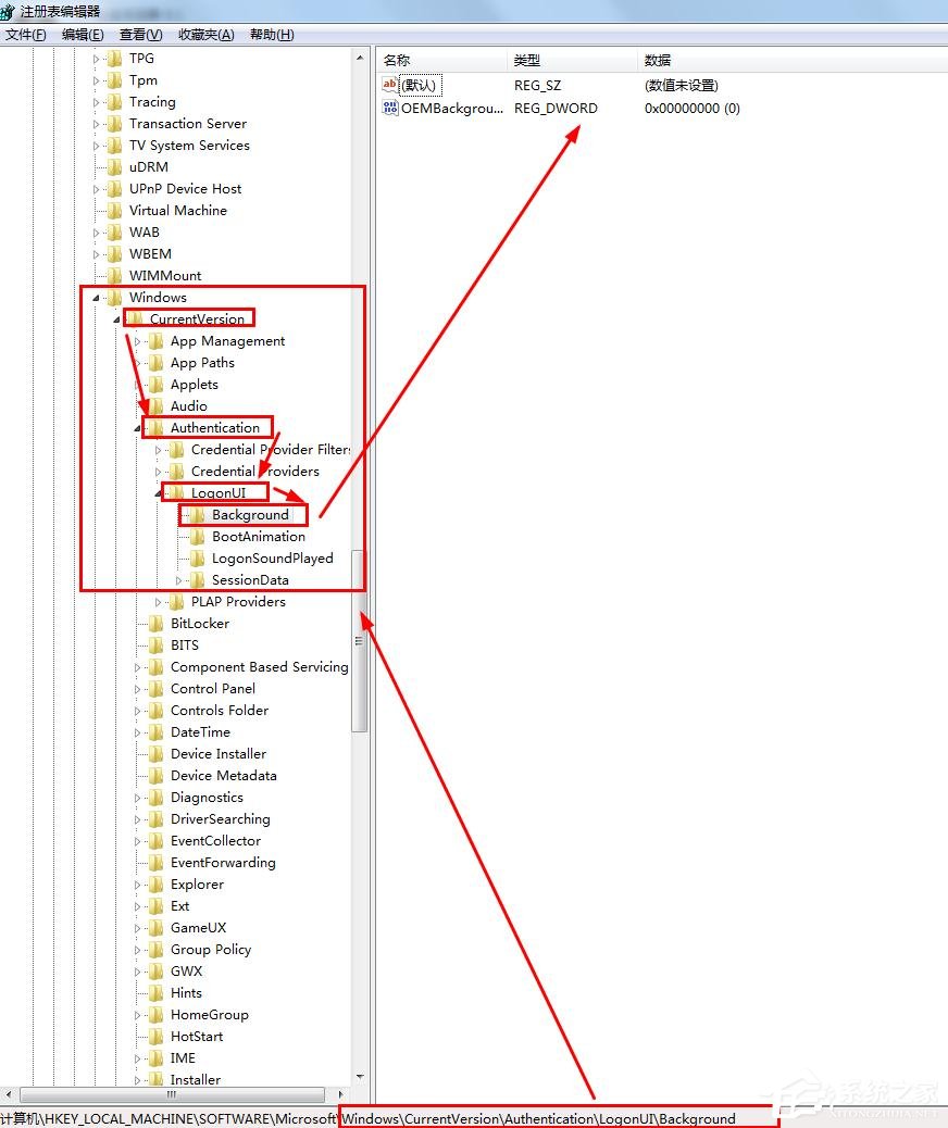 2、然后在左侧目录树中,按路径HKEY_LOCAL_MACHINE---SOFTWARE---Microsoft---Windows---CurrentVersion--- Authentication---LogonUI---Background点开;
