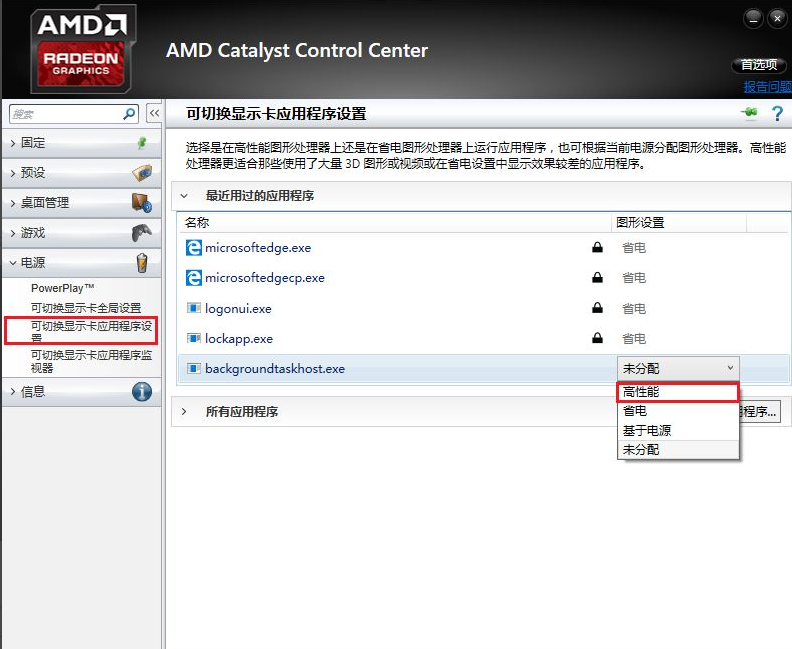 6、在”所有应用程序“栏中就会出现你刚才添加的程序,你同样可以将其工作方式设置为”高性能“,完成后点击”应用“。