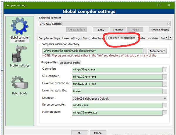 2、然后转到Toolchain exectables,即可执行的工具链接(或者说地址吧,windows中链接指向的就是地址,意思就是你的编译器工具的地址);