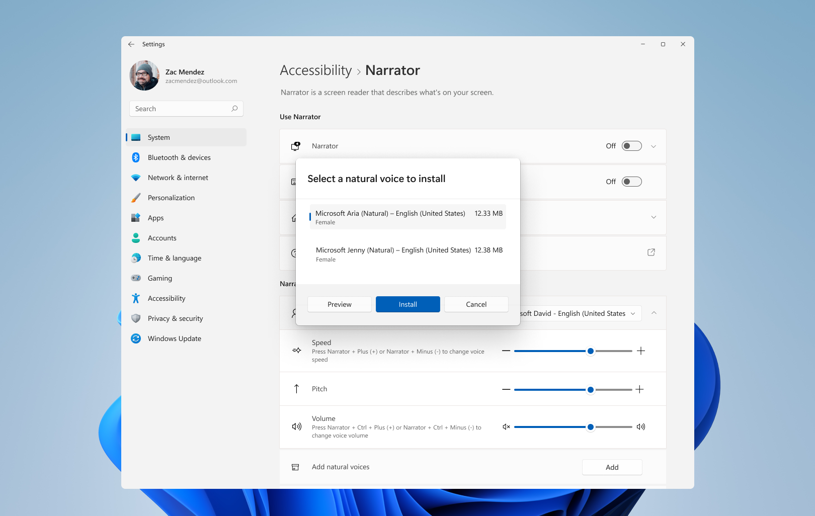在公告窗口中选择“立即安装”以转到“讲述人设置”以添加新声音。从那里您可以选择“添加自然声音”部分下的“添加”按钮。该对话框允许您选择“Jenny”或“Aria”声音。两种声音都可以安装,但必须单独安装。您可以单击“预览”来试听语音,您可以选择“安装”开始下载所选语音。