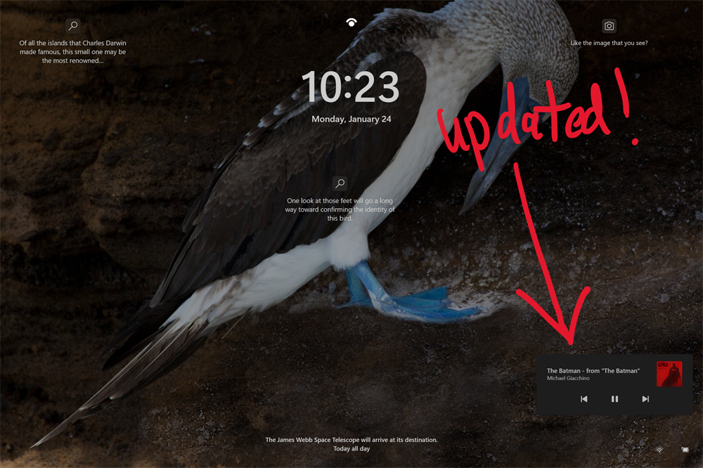 基于最近对硬件指示器弹出设计的更改,我们更新了在支持的应用程序中播放音乐时出现在锁定屏幕上的媒体控件。当登录到您的 PC 时,它与“快速设置”中为媒体控件显示的设计更加匹配。媒体控件将始终使用深色主题来补充锁定屏幕视觉样式的其余部分。[我们正开始推出此更改,因此尚未对所有内部人员可用,因为我们计划在将其推送给所有人之前监控反馈并查看它是如何落地的。]