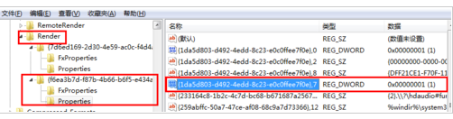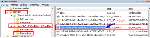 点开第2个子项{f6ea3b7d-f87b-4b66-b6f5-e434ad6955af},检查“Properties”中值为1的项,且该项括弧后面值为7。如图所示,画线处括弧后面数为7,类型:REG_DWORD 数据:0×00000001(1) 。