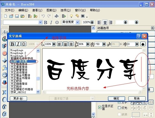 2、利用光标编辑动画内容,在字体框选择字体。如果需要更多字体,可在网上搜索‘字体下载’。步骤:打开电脑“控制面板”选择“字体”文档,将下载的字体文件托到‘“字体文件夹”即可。