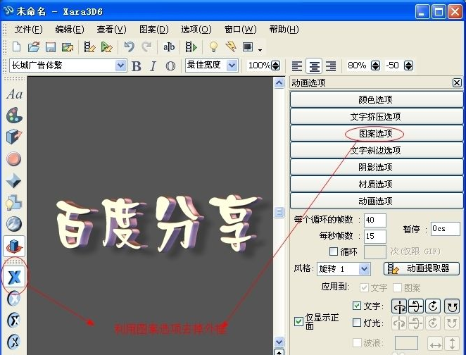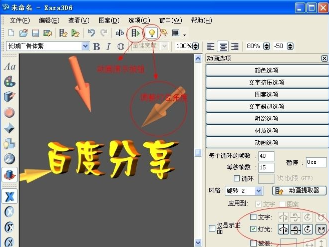 6、调整灯光角度、方向,选择文字、灯光是否旋转。点击动画演示按钮浏览制作效果。