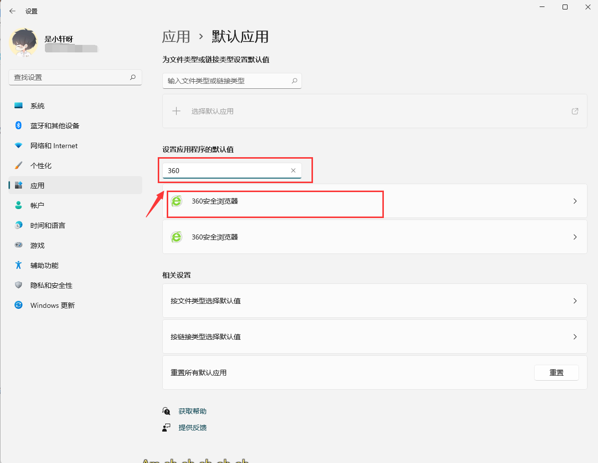 2、然后在“搜索应用程序”字段中,输入当前 Windows 11 PC 上默认浏览器的名称。小编这里是360浏览器,但如果您不确定,它也有可能是Microsoft Edge。