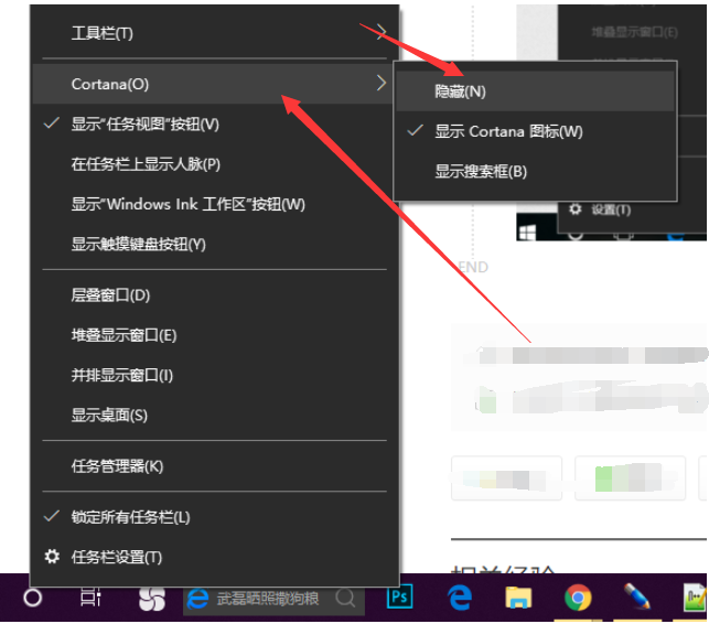 3、如果想要显示或者隐藏小娜,就直接右击任务栏,选择小娜,点击隐藏和显示就可以啦。
