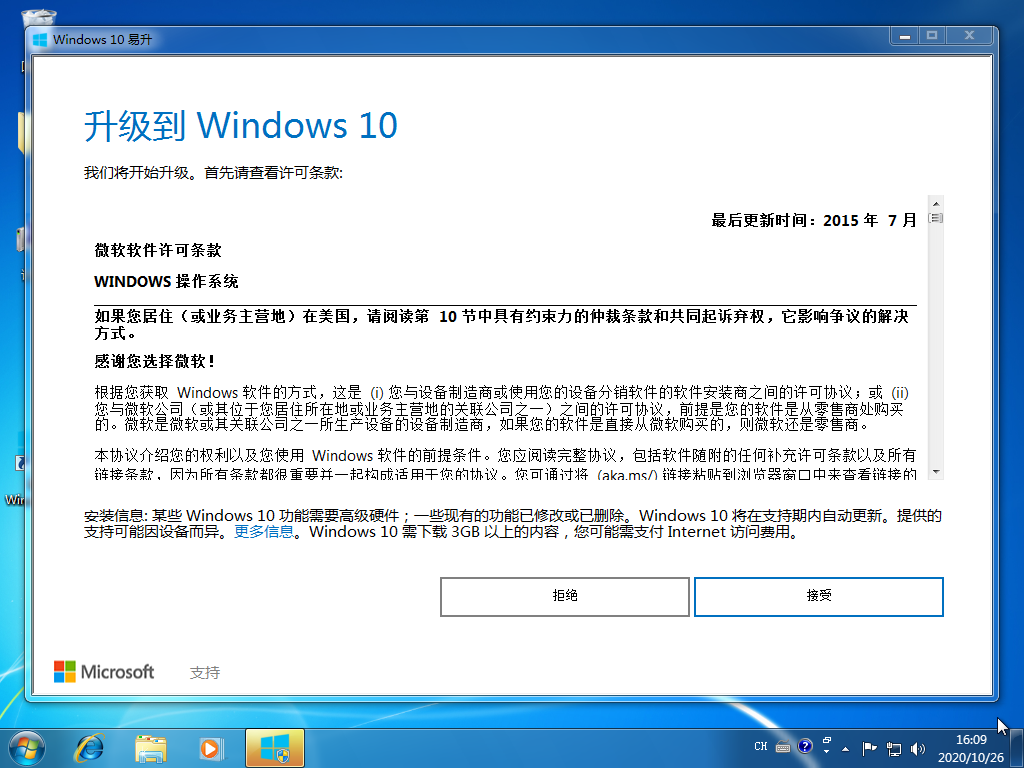 1、首先,您可以直接在微软官方下载 Windows 10 易升工具,目前已经更改名称了。打开软件后您可以直接看到升级 Windows 10,选择接受。