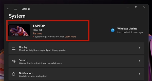 爆料好手Albacore分享的截图显示,微软正测试Win11新特性,即安装成功后继续识别硬件兼容性,如果不满足会在设置页面的系统选项弹出警告提示,这或许将阻止安装安全和功能更新的可能。