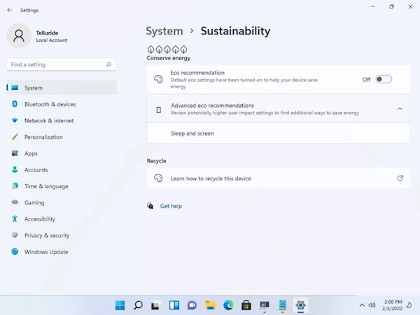 尽管当前Windows 11系统并未自带打分功能, 不过,爆料人Albacore曝光的系统界面显示,微软正添加名为“可持续性”的功能,其中包括一组由5朵树叶组成的评分体系,被点亮的绿色树也越多,表明这台电脑的生态友好度越高。