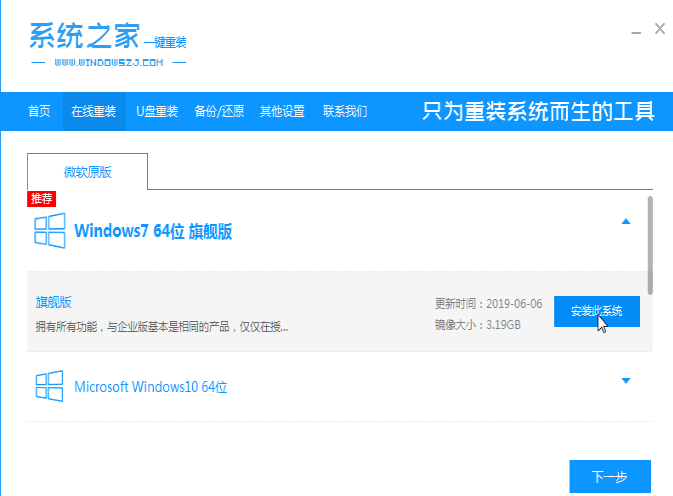 2、打开软件,点击在线重装,找到win7系统,点击安装此系统。
