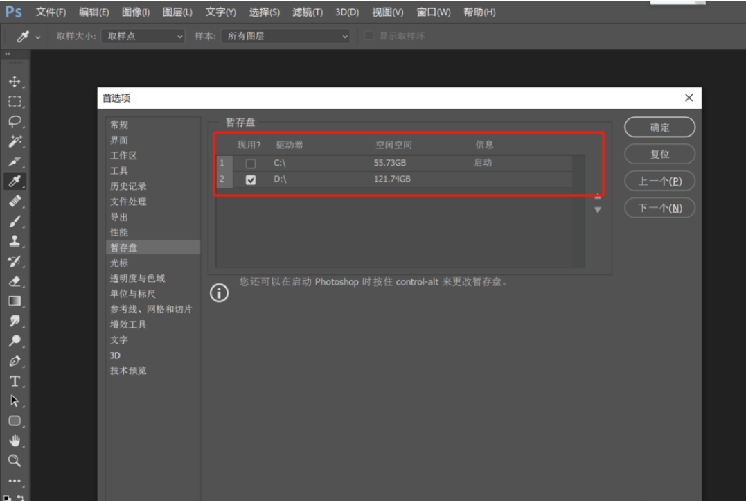 2. 在“首选项”“暂存盘”设置页面选择一个其他盘作为暂存盘,这里可以选择一个空间大点的磁盘。