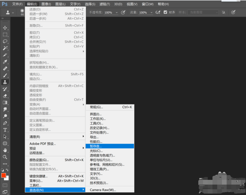 1. 点击“编辑”菜单下的“首选项”,选择“暂存盘”选项,如图所示: