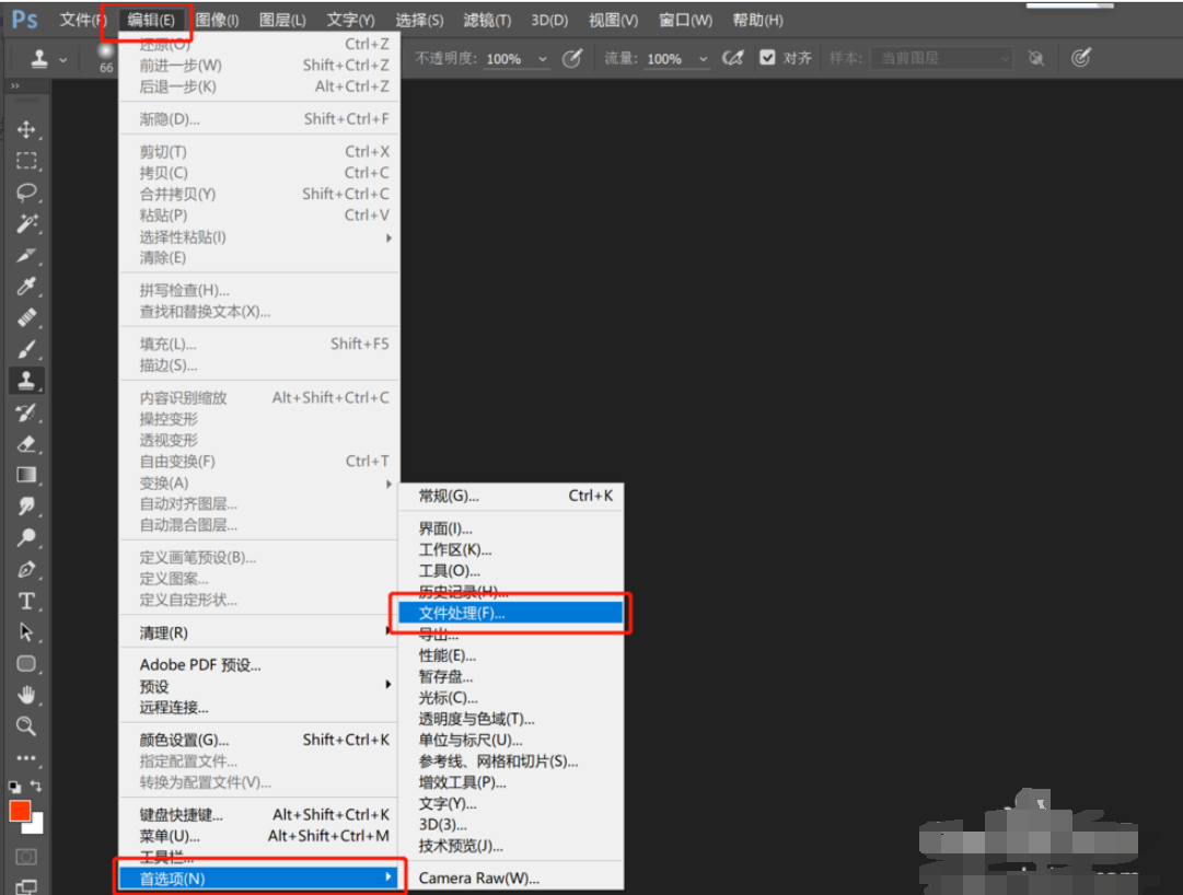 1. 点击“编辑”菜单下的“首选项”,选择“文件处理”选项