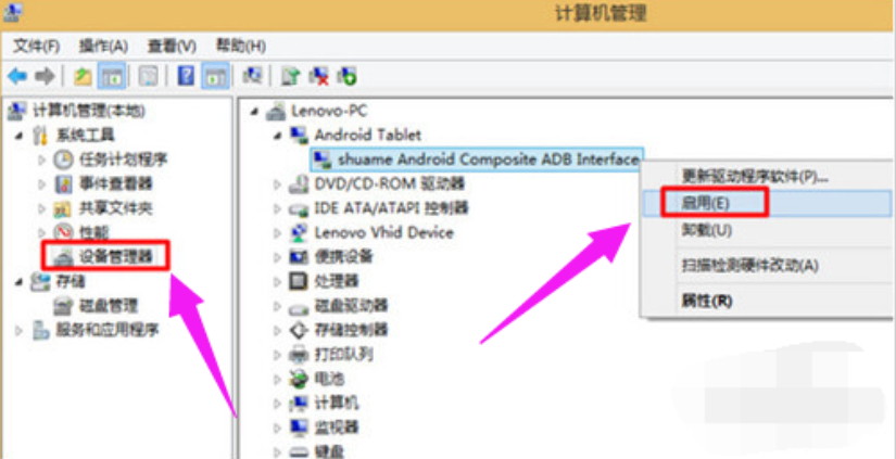 4、在打开的“计算机管理”界面中,展开Android手机项,右击被禁用的手机驱动项,选择“启用”项