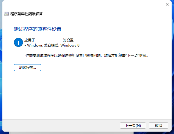 4、然后在打开的测试程序的兼容设置窗口,会自动的为应用设置兼容设置,我们点击“测试程序”看一下应用是否可以正常运行就可以了。