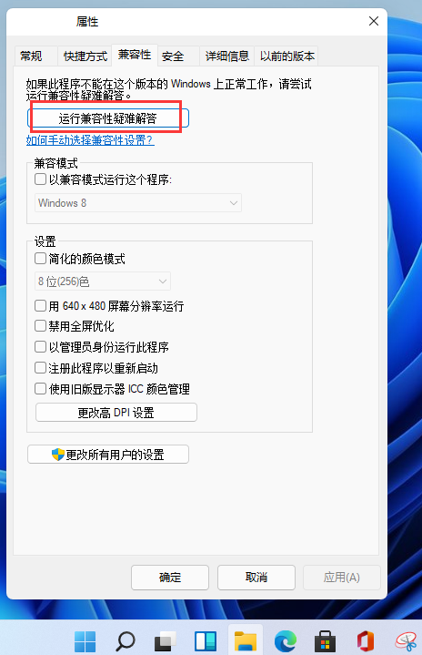 2、接下来在打开的属性窗口中点击“兼容性”的选项卡。然后点击“运行兼容性疑难解答”的按钮。当然也可以直接勾选以兼容模式运行程序。不确定兼容哪个系统就点击“运行兼容性疑难解答”。