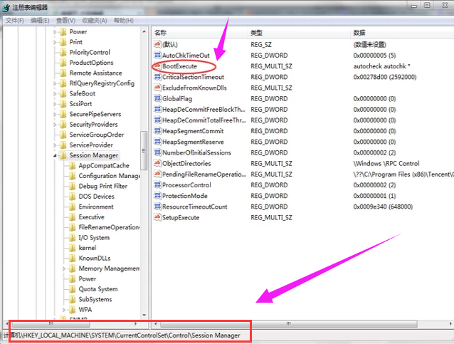 依次点击“HKEY_LOCAL_MACHINE”--“SYSTEM”--“CurrentControlSet”--“Control”--“SessionManager”。找到BootExecute项,双击将其值设置为“ autocheck autochk *即可。