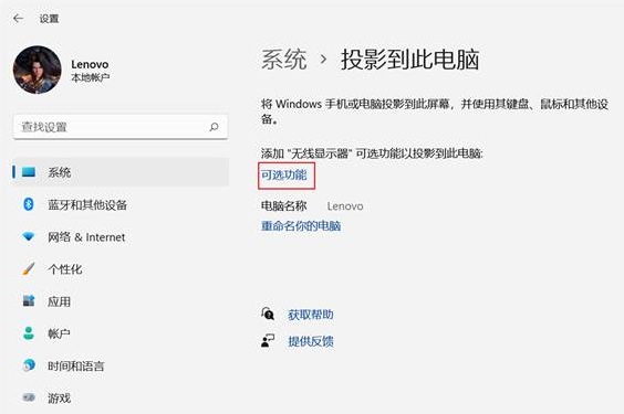 第三步:如果是第一次投影到此电脑功能,需要添加可选功能,点击可选功能。