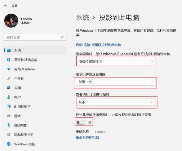 把”仅当此电脑接通电源时,才能发现此电脑以进行投影”设置为“关”。