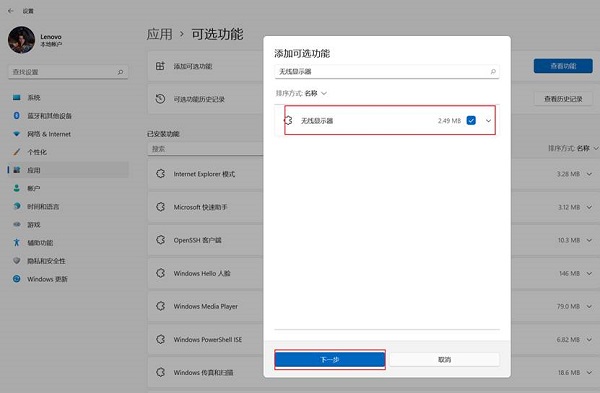 第五步:在添加可选功能界面搜索“无线显示器”,勾选“无线显示器”,点击下一步,在点击安装,安装需要一段时间,请耐心等待。