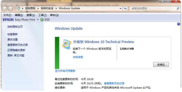 4、打开控制面板,依次进入“系统和安全”→“Windows Update”,点击页面的【检查更新】按钮。系统检查完成后可能会收到一个win10升级包。
