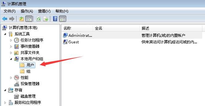 3、计算机管理窗口,点击本地用户和组下的用户。