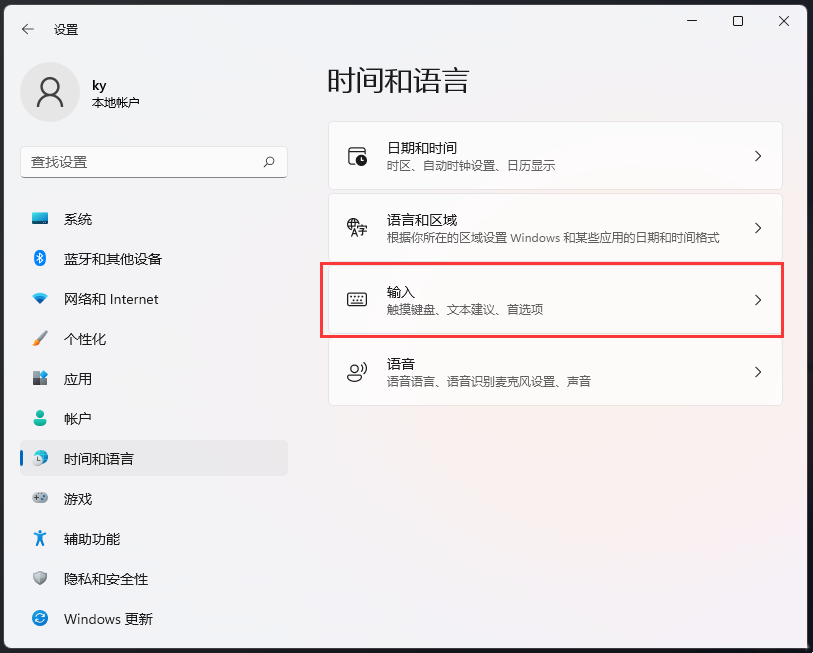 3、右侧,点击输入(触摸键盘、文本建议、首选项)。