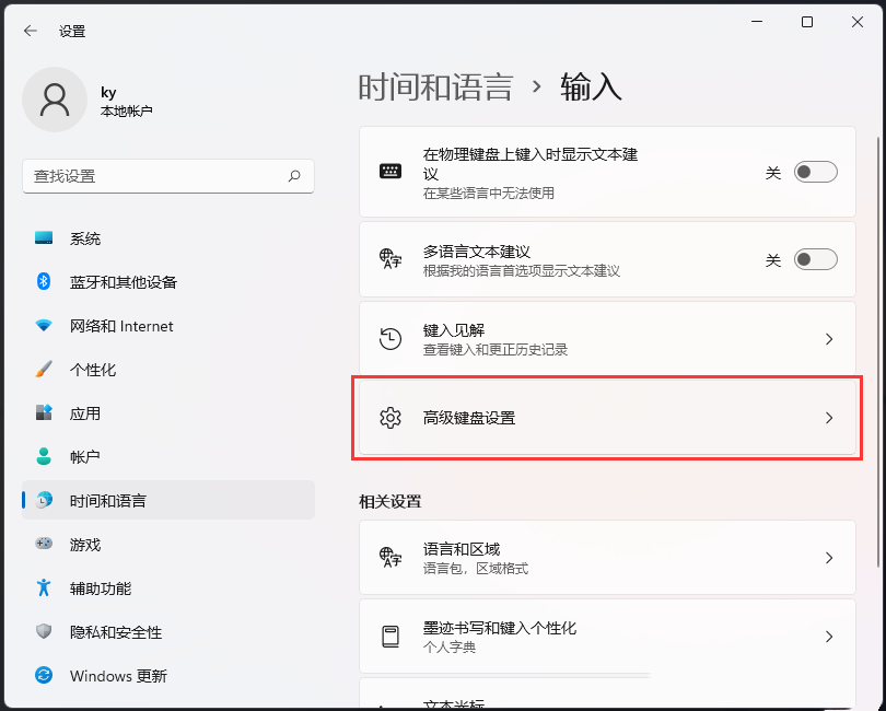 4、当前路径为:时间和语言> 输入,点击高级键盘设置。