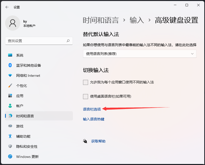 5、当前路径为:时间和语言>输入>高级键盘设置,找到并点击语言栏选项。