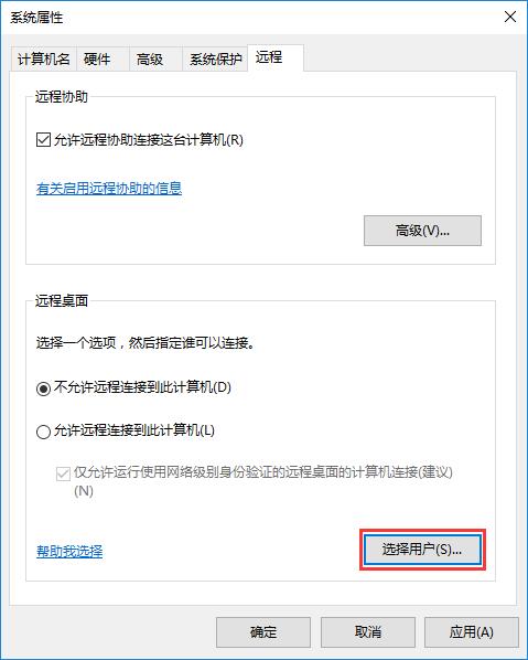 在弹出的“系统属性”菜单中勾选上“允许远程协助连接这台计算机”并在下面点击“选择用户”。