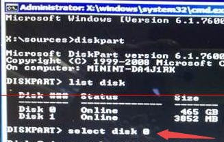 3、输入【listdisk】,按【回车】查询硬盘信息内容,留意看硬盘容积来挑选。图上465G的Disk0是电脑硬盘,3852M的Disk1是用以Win7安装的U盘。