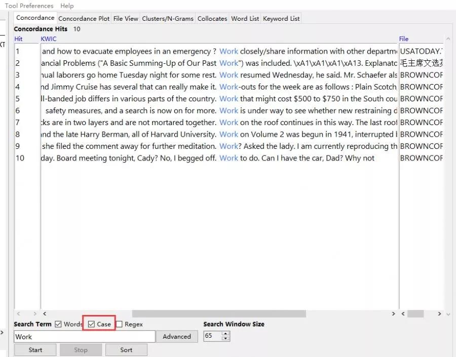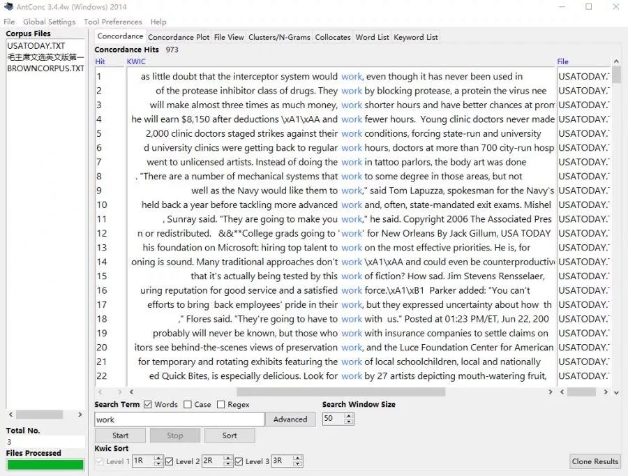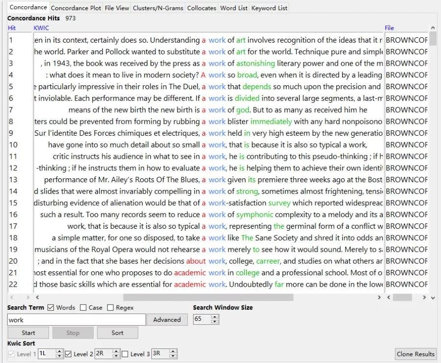 2、在下方Search Term下的输入框里输入搜索词,单击“start”。以“work”为例,可以看到三个语料库中检索到了973条结果。这种结果是以KWIC(Key Word in Context)模式显示的。如果需要调整检索词两边显示的字符数,可以使用“Search Window Size”进行调整(调整完成后单击start重新检索)。