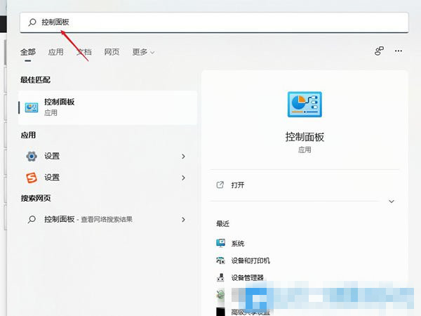 1、点击开始按钮旁边的【搜索图标】,搜索框中输入【控制面板】,然后点击打开系统给出的最佳匹配【控制面板应用】;