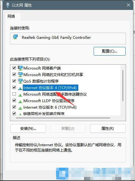 4、以太网 属性窗口,双击打开【Internet 协议版本 4 (TCP/IPv4)】;