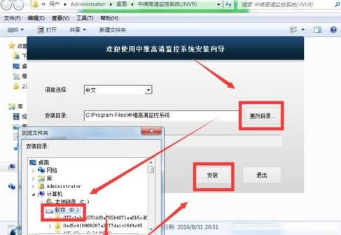 1、【欢迎使用中维高清监控系统安装向导】的窗口,安装目录这一项点击“更改目录”选择“软件(D)”,再点击“确定”,然后点击“安装”,如下图所示: