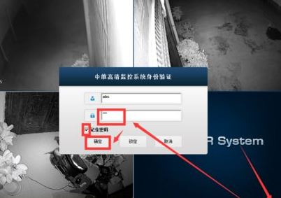 4、最后摄像头的监控页面就出来了,点击右下角圆中有一杠的形状,(是让监控在后台运行工作)需要登录,输入你密码,勾选记住密码省的下次还要再输入密码,点击“确定”即可,如下图所示: