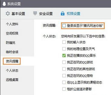 3、在系统设置左侧列表就可以看到“资讯提醒”这四个字,鼠标点击就可以在右侧出现对应的,我们要关闭的腾讯网迷你版的去除复选框,点击将勾勾去除保存就可以了。
