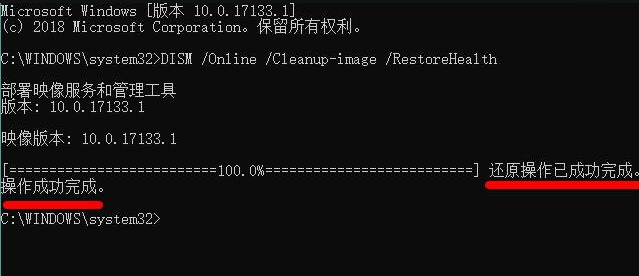 7、DISM /Online /Cleanup-image /RestoreHealth命令复制成功后,按下回车,在连接网络状态下,将系统映像文件中将不相同的文件还原成官方系统原文件。